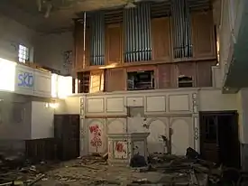 The vandalised interior in early 2016, before the fire, showing the original organ
