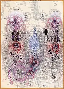 The main theme in Luboš Plný's art is the human body - its functioning, its limitations, and its mortality. Most of his works could be called “anatomical self-portraits”, in which he mixes drawing, painting and conceptual art with scientific project. He combines color ink with acrylic paint and collage, and includes organic elements such as blood, hair, the ashes of his dead parents, used medical aids, and “evidentiary objects” from his experiments on his own body.[3]