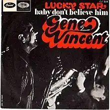 Vincent's version of Burgess' song occurred after Vincent was forced to cancel the remainder of a UK tour after collapsing in Glasgow and then, after two days in the Glasgow Royal Infirmary, collapsing again in Rumford and being flown home. Vincent's first return to work after this incident was a low-pressure session in October 1961 at the Capitol studios in Hollywood with Burgess and his band. Dave Burgess was an old friend, who was in The Champs when they'd toured with the Blue Caps.[6] Lucky Star and the B-Side – a cover version of Clyde Pitts' "Baby Don't Believe Him", which Pitts also released in 1961 – were the result of the session.[7] The track was released as a single in the fifth week of November 1961.[8] It was his last USA Capitol single. In March 1962 Vincent was back in the UK touring with Brenda Lee and included the new song "Lucky Star" in a set consisting mainly of older hits.[9] The song has been reissued on several compilation albums including A Portrait of Gene Vincent and Gene Vincent's 20 Greatest.[10] Coincidentally Vincent was the first American to appear on the show Thank Your Lucky Stars.[11]