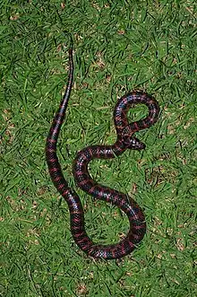 L. rufozonatus is known by several common names, including "Asian king snake",[8] "banded red snake", "red banded krait", "red banded odd-toothed snake" and "red-banded snake".[4]
