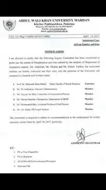 I am directed to notify that the following Inquiry Committee has been constituted to probe into the matter of blasphemous activities carried by the students of Department of Journalism namely, Mr. Abdullah, Mr. Mashal and Mr. Zubair. Further, the mentioned students are hereby rusticated and their entry into the premises of the University (all campuses) is banned until further orders