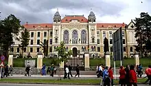 The cornerstone was laid in May 1909, and the building was inaugurated in June 1911 by Count Gusztáv Károly Majláth, bishop of Transylvania. The right (south) wing, meant for a seminary, was finished in 1913. The left (north) wing was a dormitory with twelve bedrooms, eight study rooms and other features. The building was very modern for its time, but World War I began a few years after its opening, and it was partly transformed into a military hospital. Furniture and books were destroyed, statues disappeared, the chemistry laboratory was left empty, the coin and antiques collection was decimated.[1] Courses stopped entirely for the 1916-1917 year.[2]