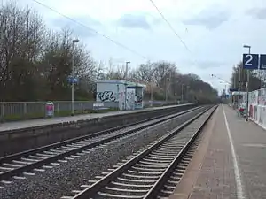 Mönchengladbach-Lürrip station is a through station in the town of Mönchengladbach in the German state of North Rhine-Westphalia. The station was opened in 1980 or 1981[5] on the Mönchengladbach–Düsseldorf railway opened between Mönchengladbach and Neuss by the Aachen-Düsseldorf-Ruhrort Railway Company on 16 December 1852.[6] It has two platform tracks and it is classified by Deutsche Bahn as a category 6 station.[1]