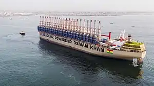 The Turkish company Karadeniz Holding purchased the vessel MV Pacific Triangle end 2014 for US$17 million from Teekay Shipping.[4] The bulk carrier was converted into a Powership with a generation capacity of 470 MW at Hat-San Shipyard in Altinova, Yalova. On November 13, 2016, the Powership, renamed MV Karadeniz Powership Osman Khan, sailed to Ghana in a ceremony attended by the President Recep Tayyip Erdoğan, Prime Minister Binali Yıldırım, Minister of Transport, Maritime and Communication Ahmet Arslan and other officials. She was commissioned to supply electricity to the power grid in Ghana.[5] She is world's biggest Powership.