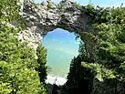 ![]() ![]() ![]() ![]() ![]() From left to right, top to bottom: Downtown Mackinac Island along M-185; Arch Rock; the famous Grand Hotel porch; Fort Mackinac; downtown Mackinac Island with the Mackinac Bridge in the background. | |