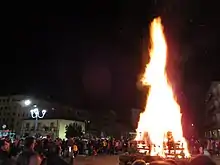 Since 1870, on 26 April at dusk the so-called focaracci[20] are kindled in all the town districts. They are devotional bonfires in honour of the Madonna di Pietraquaria, similar to the Beltane bonfires. Around them popular and religious songs and small music concerts are performed.[21] According to a legend the tradition of focaracci arose from a dispute between the populations of Avezzano and Cese about whom merited the Virgin's protection. From the top of Mount Salviano the Madonna turned towards the city of Avezzano to look at the bonfires that were lit by Avezzanese people in order to draw her attention.[22]