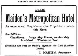 The original hotel (Metropolitan Hotel) was jointly run by two Englishmen brothers, the Maiden brothers, from 1894 onwards, and in its present location by one of them, J. Maiden, from 1903 onwards. In the early 20th century, the hotel was widely considered to be the best hotel in Delhi. At the time of the 1903 Coronation Durbar held by Lord Curzon to celebrate the coronation of Edward VII as Emperor of India, the Metropolitan Hotel was the most sought after hotel accommodation in Delhi and the most expensive. The hotel was originally painted in Red in its early days.[1]