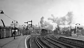 Maidstone West has a signal box — located at the southern end of the station — which is used as the point at which the mileage measurements and the "Up" and "Down" directions to London change.[3] South of the signal box, the distance from London is measured via Paddock Wood, and the Up (towards London) direction is southbound. From the signal box northwards, however, mileages are measured via Strood and the northbound line is the Up direction.[4] On 3 August 1944, the signal box was severely damaged when a doodlebug landed nearby. Seven people were killed, as well as two dray horses belonging to Maidstone brewers Fremlins. The signalbox was repaired and returned to service.[5]