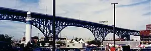 The Main Avenue (Harold H. Burton Memorial) Bridge (alternately Main Avenue Viaduct[2]) is a cantilever truss bridge in Cleveland, Ohio carrying Ohio State Route 2/Cleveland Memorial Shoreway over the Cuyahoga River.[3] The bridge, completed in 1939, is 8,000 feet (2,400 m) in length, and was the longest elevated structure in Ohio[4] until the 2007 completion of the Veterans' Glass City Skyway in Toledo. It was named for Harold H. Burton, 45th mayor of Cleveland, in late January 1986.[5] The bridge replaced an 1869 bridge at the same site,[4] and was built in conjunction with construction of the Cleveland Memorial Shoreway.[6]