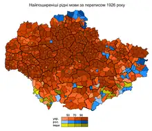 Map of the most common native languages in the districts and cities of the Ukrainian SSR, developed by the Soviet Census of December 1926.