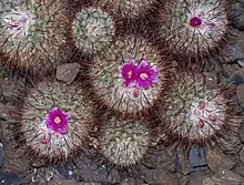 Mammillaria bombycina is one of many Mamillaria species to be cultivated, and is among the easiest.[3] In temperate regions it must be grown under glass with heat, preferably in full sun. It has gained the Royal Horticultural Society's Award of Garden Merit.[4][5] The plant can be grown from seeds which are collected from the ripe fruits.[6]
