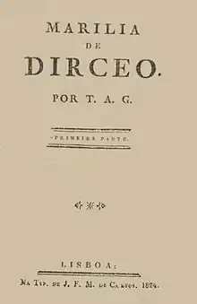 Marília de Dirceu (English: Dirceu's Marília) is a poetry book written by Luso-Brazilian Neoclassic poet Tomás António Gonzaga. It is divided in three parts — all of them published in different years. The first part, published in 1792, has 33 "lyres" (or poems), and they tell mostly about Gonzaga's (using the pen name Dirceu on the book) love by a woman named Marília (who was, in real life, a girlfriend of his, Maria Doroteia Joaquina de Seixas Brandão). The second part, published in 1799, was written when Gonzaga was serving time in Ilha das Cobras because of his involvement with the unsuccessful Minas Conspiracy. Its 38 lyres focus now on Gonzaga's longing for freedom. The third part, published in 1802, has 9 lyres and 13 sonnets, and its authorship is disputed.