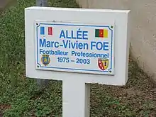 It was suggested that the Confederations Cup and the Stade Gerland could have been renamed after him, and Manchester City manager Kevin Keegan announced that the club would no longer use the number 23 shirt Foé wore during his successful season there. At Manchester City's former ground, Maine Road, there is a small memorial to him in the stadium's memorial garden, and on the walls of the players' tunnel are plaques paid for by supporters, with their names, dubbed the Walk of Pride. The first plaque on the wall is for Marc and reads "Marc Vivien Foé – 1975–2003". His first club, Lens, gave his name to an avenue near the Stade Félix Bollaert. Foé was given a state funeral in Cameroon.[1]