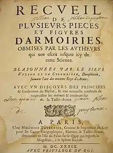 • Carte métodique et introduction succinte à la cognoissance des premières regles du blazon et des principales pieces qu'on employe pour la construction des armoiries, avec les termes dont on se sert pour parler pertinemment de ceste heroïque science... Par Marc de Vulson, sieur de La Colombiere. Paris: M. Van Lochom, 1645