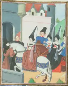 Margaret and Louis' marriage shows both the nature of medieval royal diplomacy and the precarious position of the French monarchy. The marriage took place 25 June 1436 in the afternoon in the chapel of the castle of Tours and was presided by the Archbishop of Reims. By the standards of the time, it was a very plain wedding.[3] Louis, nearly thirteen, looked clearly more mature than his bride, eleven. Margaret looked like a beautiful "doll", perhaps because she was treated as such by her in-laws.[3] Charles wore "grey riding pants" and "did not even bother to remove his spurs".[3] The Scottish guests were quickly hustled out after the wedding reception. This was seen as something of a scandal by the Scots. King Charles' attire and the speed with which the guests were hustled out was considered an insult to Scotland, which was an important ally in France's war with the English. However, this spoke to the impoverished nature of the French court at this time. They simply could not afford an extravagant ceremony or to host their Scottish guests for any longer than they did.[2]