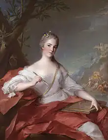 According to the traditional description of the event, she received an invitation to an assignation from both the king and the dauphin at the same occasion; she showed her husband the invitation, and it was decided that she should accept the invitation of the king. Reportedly, she did so for monetary concerns. On a later occasion, however, she also accepted an assignation with the dauphin, and for a time she alternated as the lover of both who, as expressed by René Louis de Voyer de Paulmy d'Argenson, "sailed to Cythera on the same ship".[2] In both cases the relationship was an unofficial one and in no effect was she ever an officially acknowledged mistress to either of them.
