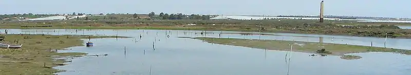 A tidal marsh with Arthrocaulon macrostachyum (former Arthrocnemum) as typical vegetation, it also shelters protected endemic relic species Picris wilkommi and other rare species such as Armeria linkiana and Spergularia fimbriata, spread over about 166 hectares. Its basin is transformed by saltworks. See Flora for the species specific to the marsh.