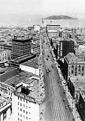 Early in the morning of April 18, 1906, an earthquake lasting less than a minute and subsequent fire left many of the buildings along Market Street in ruins;[18] in some cases, buildings were dynamited to prevent the spread of flames. The burned area extended from Dolores and Franklin east to the waterfront.[19] Within days, prominent citizens and property owners announced plans to rebuild their buildings along Market.[20] United Railroads traffic was temporarily rerouted to Fillmore Street, and repairs to the tracks on Market were underway by April 22.[21]