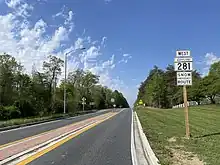 Maryland Route 281 (MD 281) is a state highway in the U.S. state of Maryland. Known for most of its length as Red Hill Road, the state highway runs 2.12 miles (3.41 km) from MD 7 east to the Delaware state line in Elkton in northeastern Cecil County. MD 281 and its continuation in Delaware were originally blazed in the 18th century as part of the Old Post Road between Baltimore and Philadelphia. The route was part of the Elk and Christiana Turnpike in the early 19th century and later the Old Baltimore Pike, but it was replaced as the main highway east from Elkton by U.S. Route 40 (US 40) in the early 20th century. MD 281 was constructed in Elkton in the early 1930s. The highway designation was extended east to the state line in the late 1950s; that extension was reconstructed in the early 1960s.
