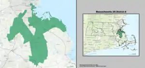 Massachusetts's 8th congressional district is located in eastern Massachusetts, including part of Boston. It is represented by Democrat Stephen Lynch. For one congressional term (1791–1793), it served as the home district of the District of Maine. The district boundaries were significantly changed, as of the elections of 2012, due to redistricting after the 2010 census, with the old 8th district largely being shifted to the new 7th district.[3] The new 8th district comprises many of the communities of the old 9th district, as well as some easternmost Norfolk County communities and northernmost Plymouth County communities of the old 10th district.