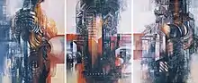 His works, like that of his brother Antonio, tend to deal with urban themes, often about human decadence. Images are not realistic and are generally distorted. His works often contain urban landscapes with a chaotic feel. The Aus der Tiefe series deals with the violence in human society, which the artist has said continues to grow. Vega considers his works to be cathartic, especially for him as he paints.[4]) He states that his main influences are Francisco Goya, Francis Bacon, and Giovanni Battista Piranesi as well as German Expressionism, and Goya’s Black Paintings. He mostly uses acrylics because they dry faster than oils.[3] According to art critic Carlos Blas Galindo, García Vega’s works are meant to disquiet, move, impact, impress, surprise, and amaze onlookers. His images can evoke a sense of terror, the sublime, the sinister, the grotesque, the brutal, and the dramatic. His works are often done in diptychs and triptychs.[2]