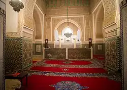 Behind the courtyard's eastern wall are the mausoleum chamber and adjoining rooms. The northernmost of these rooms, which can be accessed directly from the northeastern corner of the courtyard, consists of an indoor patio or courtyard covered by a high cupola ceiling.[4][12] The layout of this patio is similar to the Chamber of the Twelve Columns in the Saadian Tombs, consisting of a square delineated by twelve marble columns arranged in groups of three at each corner, around which runs a gallery space.[4] Another mihrab is set into the eastern wall, while a small side-chamber is set into the western wall. The pavement and lower walls are decorated with zellij tilework that feature circular or radiating geometric patterns, typical of Moroccan architecture. The upper walls and the areas around the mihrab and doorways are decorated with carved and painted stucco featuring arabesque and epigraphic motifs also typical of Moroccan architecture. At the center of the patio is an ornate fountain, and while the cupola ceiling above primarily features painted and carved wood. The cupola is high enough to allow for windows that bring in natural light. The marble columns feature Moroccan-Andalusian capitals carved with leaf, palm, and palmette motifs.[12][4] These marble columns, as well as the ornately-carved marble panels in the archway leading to the mausoleum antechamber, are believed to be spolia taken by Moulay Isma'il from the former Saadian palaces of in the Kasbah of Marrakesh (such as the Badi Palace).[15]:270