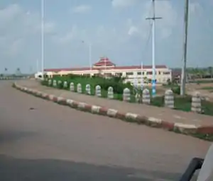 During the British colonial era, the Moulmein railway station was the terminus of isolated Mawlamyine-Ye line on the Tanintharyi coast. The line from Yangon stopped at Mottama (Martaban), and passengers had to take a ferry over the Thanlwin River (Salween River) to Mawlamyine. Only in 2006, with the opening of the Thanlwin Bridge, did a direct link to the rest of the national rail network become possible. A new station, reportedly built to the standards of an "ASEAN railway station", was opened on 17 April 2006.[2] The station is located in Myenigon, approximately 3 kilometres (1.9 mi) east of the city's main market, Zegyi.[3]