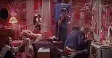 A music video for "Me & You Together Song", directed by Bedroom, was released on 6 February 2020.[61] Filmed in a retro style reminiscent of 1990s music videos, it includes homages to 1990s culture such as mix CDs, boomboxes, Converse, rooms covered in band posters, and retro T-shirts.[62][26] The music video begins with a young woman inserting a CD mixtape into her boombox before dancing on her bed. The video pivots to a house party as the song progresses, while scenes of the band performing are interspersed.[61] The bedrooms are shown to be interconnected, while at the same time the partygoers begin locking eyes with each other.[63] As the couples in the bedrooms and the party begin making out, the 1975 are shown performing in the house and the partygoers gather around them.[64] As the video concludes, the entire apartment in which the video takes place is shown to be built on a sound stage.[63]