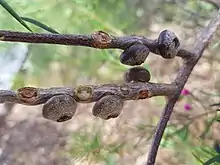 The flowers are usually bright red, but sometimes other shades of red, pink or white and are arranged in spikes on the sides of the branches. The spikes are up to 40 millimetres (2 in) in diameter and 40 millimetres (2 in) long. Each spike contains 6 to 20 individual flowers arranged in a decussate pattern. The stamens are arranged in five bundles around the flower, each bundle containing 22 to 80 stamens. The stamen filaments are 7.5–13 millimetres (0.3–0.5 in)long. The flowers appear from July to December but mostly in September and October although flowering time is irregular. The fruits which follow the flowers are woody capsules, shaped like a squashed urn and arranged in alternating pairs along the stems.[1][2]