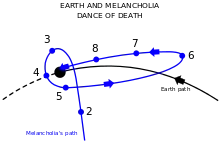 Melancholia's first approach and final collision with Earth, as described (and shown briefly in a similar diagram) in the film.
