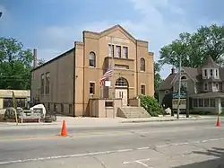 The Richmond Memorial Hall was built in 1907 with a US$ 10,000 bequest from Charles Dewitt McConnell, grandson of Richmond's first settler, William McConnell. The bequest was filed in McConnell's will on September 3, 1903 and by 1905 the village had organized a committee to begin investigating a site to build Memorial Hall.[2] McConnell's will called for a city or village hall to be built and used for government administration and for school and church activities free of charge. In the 1930s, Memorial Hall housed the J.B. Rotnour Troupe, providing entertainment for the town, but the building has also served as the village hall, police department, community library, a school gymnasium and a home for the American Legion.[3] The village government's offices have since moved to a different location at 5600 Hunter Drive.[2] In April 2021 Memorial Hall was sold by the Village of Richmond to a private owner for the sum of $230,000 and the interior of the building is currently undergoing remodeling to facilitate its use for commercial purposes.
