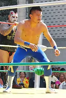 Abraham Arrieta González is a Mexican luchador, or professional wrestler currently working for the Mexican professional wrestling promotion Consejo Mundial de Lucha Libre (CMLL) working under the ring name Mercurio (Spanish for Mercury), where he is the current CMLL World Mini-Estrella Champion, in his first reign. As Mercurio González works in CMLL's Mini-Estrella division, which does not necessarily mean that Mercurio is a dwarf as several wrestlers who are just shorter in stature work in the "Mini" division.[4] Mercurio's real name was not a matter of public record while masked, as is often the case with masked wrestlers in Mexico where their private lives are kept a secret from the wrestling fans.[5]
