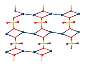 In the crystal, mercurous sulfate is made up of Hg22+ center with an Hg-Hg distance of about 2.50 Å. The SO42− anions form both long and short Hg-O bonds ranging from 2.23 to 2.93 Å.[5]