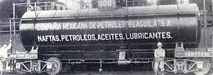 Oil production in Mexico was begun in 1901 by a US oil investor, Henry Clay Pierce.[3] He was quickly followed by a rival, Edward L. Doheny, in the same year.[3] Pearson's land surveys in the vicinities of Pedregal and San Cristóbal for the route of the Tehuantepec Railway had reported oil seepage from the ground, so in April 1901 he ordered his manager in Mexico to secure prospecting options on "...all land for miles around".[4] Pearson built a refinery, pipelines and port facilities to handle the oil in 1905–06, but his company didn't make a major oil strike until 1908.[5] In the same year one of Pearson's oil strikes caught fire and burned out of control for eight weeks, destroying the entire oil field.[5]