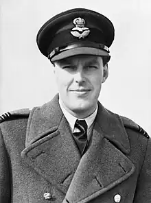 In a photograph taken on the occasion of the presentation of No. 609 Squadron's crest, Robinson stands second right in this group; his father, Sir Roy Robinson, stands first right