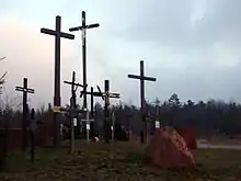 Political and economic changes that took place in Poland after 1989 resulted in the split of the Honorary Committee. This fact, as well as financial difficulties, forced modification of the project and significantly delayed its implementation.[119][120] However, the idea of building a mausoleum has never been abandoned. On May 9, 1991, the "Monument-Mausoleum" Foundation was established in Michniów.[121] In July 1993 – on the 50th anniversary of the pacification – the "Pieta Michniowska" statue by Wacław Stawecki was unveiled in Michniów.[122] In July 1997 a new House of National Remembrance was opened. Since then, it houses a permanent exhibition and research center documenting the martyrdom of the Polish countryside during World War II. At the same time, the so-called Sanctuary of the Martyr's Polish Village, where crosses symbolizing Polish villages pacified by the Germans in 1939–1945 are placed[123] (there are currently several hundred of them). A monument "Pożoga Wołyń" was unveiled in the sanctuary, commemorating Polish villages murdered in Volhynia by Ukrainian nationalists.