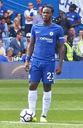 In April 2016, English Premier League club West Ham United were reported as the favourites to sign Batshuayi, having offered a €35 million bid.[26] Two months later, their London neighbours Crystal Palace made a €38 million (£31.5 million) bid which would have made him their record signing, while Italian champions Juventus were also among the interested parties.[19] Although Palace's bid was accepted, Batshuayi did not want to make the move, instead engaging with a €40 million (£33.2 million) offer from Chelsea, for which he left Belgium's UEFA Euro 2016 squad to undergo a medical.[27] On 3 July, he signed a five-year deal at Chelsea.[28] He was the first signing by their new manager Antonio Conte, and said his aim was to get the team back to winning the Premier League and qualifying for the UEFA Champions League.[29] Batshuayi added he was eager to work alongside their midfielder Oscar.[30] Batshuayi joined Chelsea for pre-season in Austria, and on 20 July, he made his debut in a friendly against Wolfsberger AC.[31] A day later, he scored his first two goals in an 8–0 friendly victory against Atus Ferlach.[32]