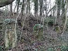 The station buildings, including the platforms, were all of timber construction and was built on an embankment. This made it susceptible to subsidence and landslips. In 1955, part of the down (towards Manchester) platform and the waiting shelter were lost when the embankment collapsed. As the usage of the station was not high, replacing the lost section was considered uneconomic and reconstruction was not carried out; however, there are some remains of the support pillars for both sides of the station.[6]