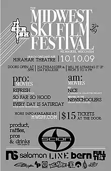 The films shown were Refresh by Level 1 Productions,[4] Every Day is a Saturday by Poorboyz Productions,[5] So Far So Hood by 4bi9 Media, NICE a Minnesota collaborative movie,[6] and Newschoolers.com contest winner Let's Dance by Jibulant Productions.[7] Sponsors of the 2009 MWSFF were Jiberish Clothing, and Scion. The after party was thrown at the Thirdward, LLC Headquarters and, like the film festival, featured the musical stylings of Hathbanger and Daywalker.