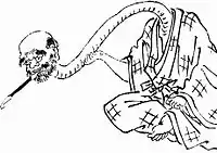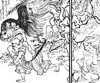 Mikoshi-nyūdō (見越し入道 or 見越入道) is a type of bald-headed yōkai "goblin" with an ever-extending neck. In Japanese folklore and Edo period (1603–1868) kaidan "ghost story" texts, mikoshi-nyūdō will frighten people who look over the top of things such as byōbu folding screens.[1] The name combines mikoshi 見越し (lit. "see over") "looking over the top (of a fence); anticipation; expectation" and nyūdō 入道 (lit. "enter the Way") "a (Buddhist) priest; a bonze; a tonsured monster".[2]