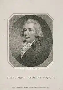 Miles Peter Andrews (1742 – 18 July 1814) was an 18th-century English playwright, gunpowder manufacturer and politician who sat in the House of Commons from 1796 to 1814.