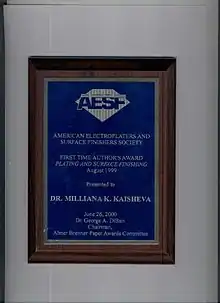 In 1999 she received the Abner Brenner Silver Medal and First Time Authors Award of the American Electroplaters & Surface Finishers’ Society for an outstanding paper published in the journal Plating and Surface Finishing.
