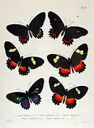 P. euryleon. The spots of the breast and abdomen red, the posterior abdominal segments with red lateral spots. Forewing above with yellowish grey area before the hindmargin, hindwing with red discal area or band. Beneath the forewing without red basal spot, the hindwing with three, but the spot placed in the cell commonly only indicated or quite absent, the discal band smaller than above, pale red. Female similar to the male or different from it; in the latter case forewing with cell-spot and two discal bands, all white, recalling pausanius and protodamas f. choridamas. Scent-organ of the male usually present. Costa Rica toEcuador. — clusoculis Butl. (13 c). Discal area of the forewing white-grey; the red band of the hindwing broad, always entering the cell. Female similar to the male, the red band of the hindwing somewhat broader. Costa Rica; Chiriqui. — pithonius R. & J. Male: forewing with small or large grey spot; hindwing with 3—5 red discal spots, the red submarginal spots of the under surface of the hindwing very small or only indicated. Female with large cell-spot on the forewing and 2 large discal spots. West Colombia and Cauca Valley. — euryleon Hew. (13 c). Male : hindwing above mostly with 4 spots placed close to the cell and two small, less distinct spots before the abdominal margin; the discal spots on the underside pale red. female: the cell-spot of the forewing narrowed anteriorly, the band of the hindwing entering the cell. Magdalena Valley, Cordillera of Bogota. — haenschi R. & J. Male :area of the forewing lighter grey than in euryleon composed of two spots, the anterior spot projecting distally; hindwing with small cell-spot, which is rarely absent, and 3—5 spots placed close to the cell; beneath the forewing has a large white spot between the 1. and 2. median, a grey- spot behind it; hind-wing with 3 pale red spots, the 1. and 2. touching the cell, a 4. spot often indicated. female: the cell-patch of the forewing does not extend across the cell, band of the hindwing running from the 1. radial to the abdominal margin, entering the cell, behind the cell proximally whitish, as in the female of the aristolochia-Papilio P. iphidamas calogyna. Male with scent-organ. In Western Ecuador. — anatmus R & J. male : the grey area of the forewing extending from the hindmargin costad as far as the 2. median or beyond, often a grey streak in the cell; hindwing with 3 red spots, separated from the cell, often only the 3. spot distinct; beneath the forewing without white spot and the discal spots of the hindwing usually grey. Female not known. Scent-organ absent in the male. East Ecuador.[1]