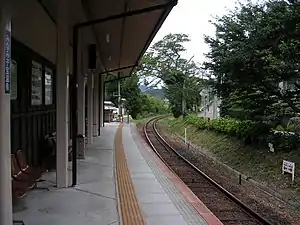Minami-Kodakara-Onsen Station has one ground-level side platform serving a single bi-directional track. The station building also contains an onsen, which passengers on the Nagaragawa Railway can use at a discount.[1] The station is staffed.