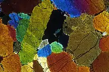 Nicholas Steno first observed the law of constancy of interfacial angles (also known as the first law of crystallography) in quartz crystals in 1669.[5]: 4 This was later generalized and established experimentally by Jean-Baptiste L. Romé de l'Islee in 1783.[6] René Just Haüy, the "father of modern crystallography", showed that crystals are periodic and established that the orientations of crystal faces can be expressed in terms of rational numbers, as later encoded in the Miller indices.[5]: 4 In 1814, Jöns Jacob Berzelius introduced a classification of minerals based on their chemistry rather than their crystal structure.[7] William Nicol developed the Nicol prism, which polarizes light, in 1827–1828 while studying fossilized wood; Henry Clifton Sorby showed that thin sections of minerals could be identified by their optical properties using a polarizing microscope.[5]: 4 [7]: 15 James D. Dana published his first edition of A System of Mineralogy in 1837, and in a later edition introduced a chemical classification that is still the standard.[5]: 4 [7]: 15 X-ray diffraction was demonstrated by Max von Laue in 1912, and developed into a tool for analyzing the crystal structure of minerals by the father/son team of William Henry Bragg and William Lawrence Bragg.[5]: 4
