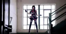 The second verse shows her in the garden dress, as she continually rides an elevator through the warehouse; in a separate scene, the background dancers also ride the elevator. In front of a flower wallpaper, Stefani wears a fluffy, pink dress as she gracefully falls to floor. The next chorus shows Stefani in a black bob wig, "walk[ing] effortlessly down some stairs in patent leather, thigh-high stilettos."[53] The song's bridge shows Stefani wearing a black and white leotard with thigh-high silver boots, sitting on a stool.[50] A black horse appears alongside Stefani who is in a black and white-striped dress, before she slowly runs away from it. The song's final chorus has Stefani riding a bicycle through a brightly-lit parking garage,[54] before she returns to the smoke machine and, once again, falls to the ground. As the song concludes, the screen fades to black.[50]