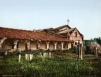False colorized photograph of Mission San Antonio de Padua from 1898.