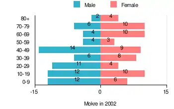 According to the 2002 Poland census, there were 135 people residing in Mokre village, of whom 52.6% were male and 47.4% were female. In the village, the population was spread out, with 25.9% under the age of 18, 35.6% from 18 to 44, 12.6% from 45 to 64, and 25.9% who were 65 years of age or older.[1]