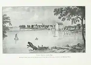 The city of Moline traces its beginnings to the arrival of David B. Sears from Cairo, Illinois in 1836.[3] He established a brush and stone mill in 1838 in what was an unincorporated area known as Rock Island Mills. Other mills were opened in the area that did everything from grinding corn and wheat to processing logs into lumber. John Deere opened his first factory along the Mississippi River in 1847, as part of a partnership, Deere, Tate, and Gould. The partnership would dissolve in 1852 and become Deere & Company. The name of the area was changed to Moline, an adaptation of the French word for "milltown."[3] Moline was incorporated into a town on April 21, 1848.[4]