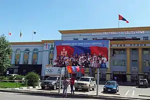 Banner in front of the Central Sports Palace in Ulaanbaatar supporting Team Mongolia